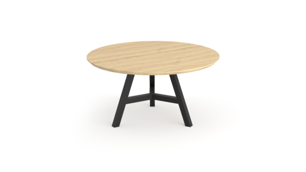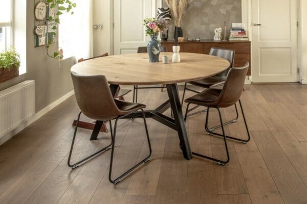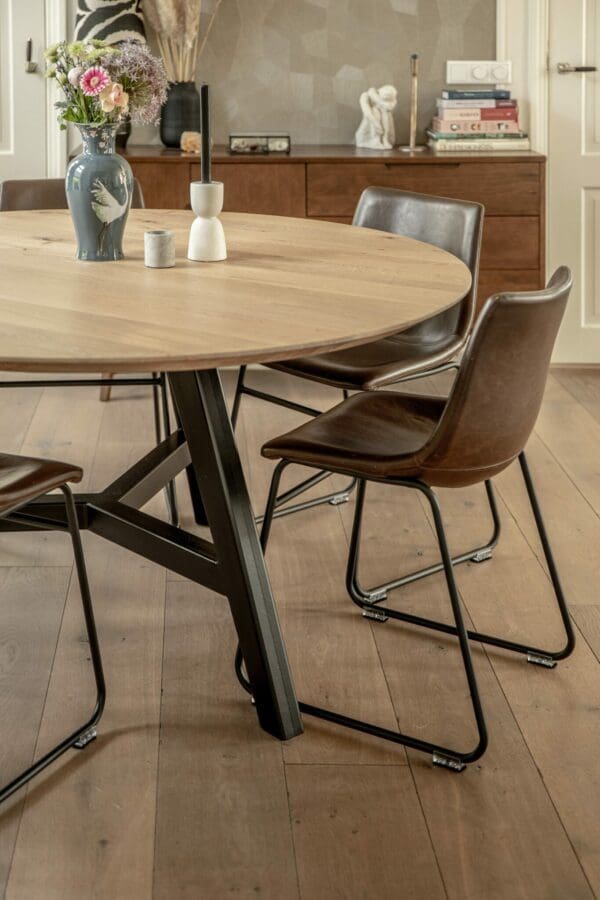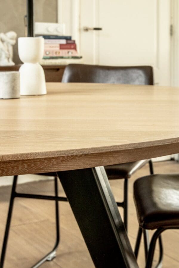 Het blad is gemaakt uit rustiek eiken, dus met meer noesten, van 4 cm dik massief Europees eiken. De rand is zwart gemaakt en ook afgerond op de hoekpunten. De behandeling is in 2 systemen – olie +lak – en kan in meerdere kleuren worden afgewerkt. Naast een mooie uitstraling, zorgt deze behandeling ervoor dat je tafel optimaal is beschermd tegen kringen en vlekken.