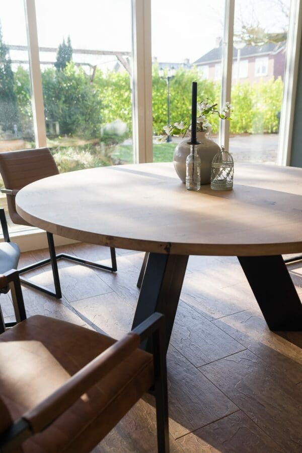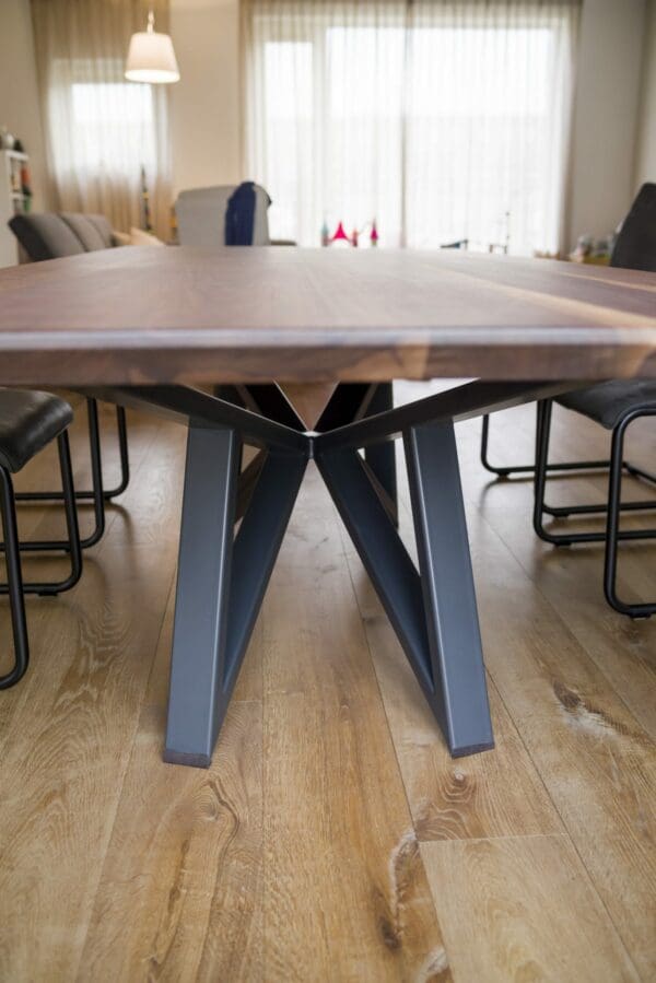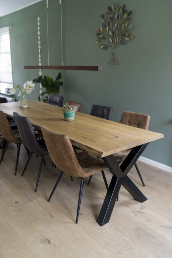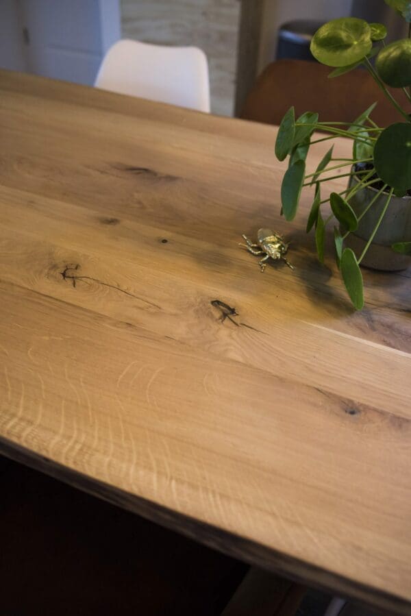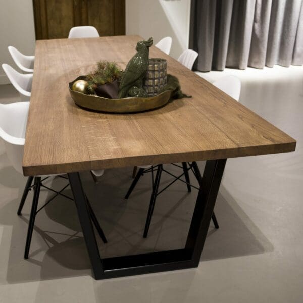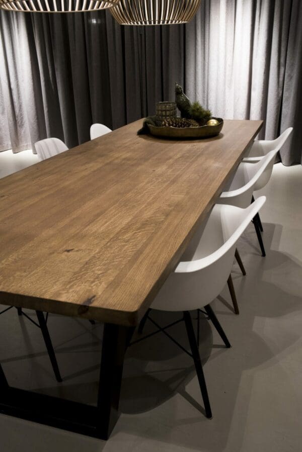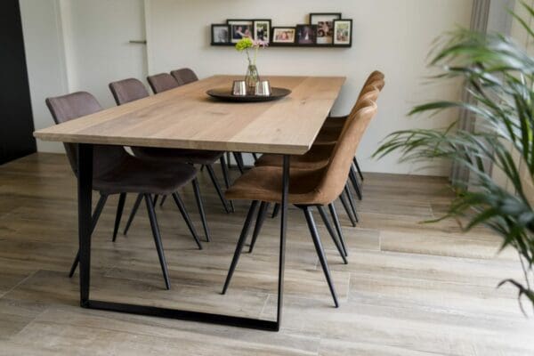 Het blad is gemaakt uit rustiek eiken, dus met meer noesten, van 4 cm dik massief Europees eiken. De rand is zwart gemaakt en ook afgerond op de hoekpunten. De behandeling is in 2 systemen – olie +lak – en kan in meerdere kleuren worden afgewerkt. Naast een mooie uitstraling, zorgt deze behandeling ervoor dat je tafel optimaal is beschermd tegen kringen en vlekken.