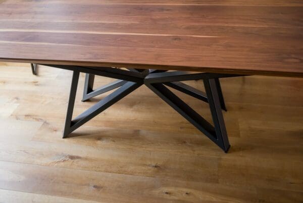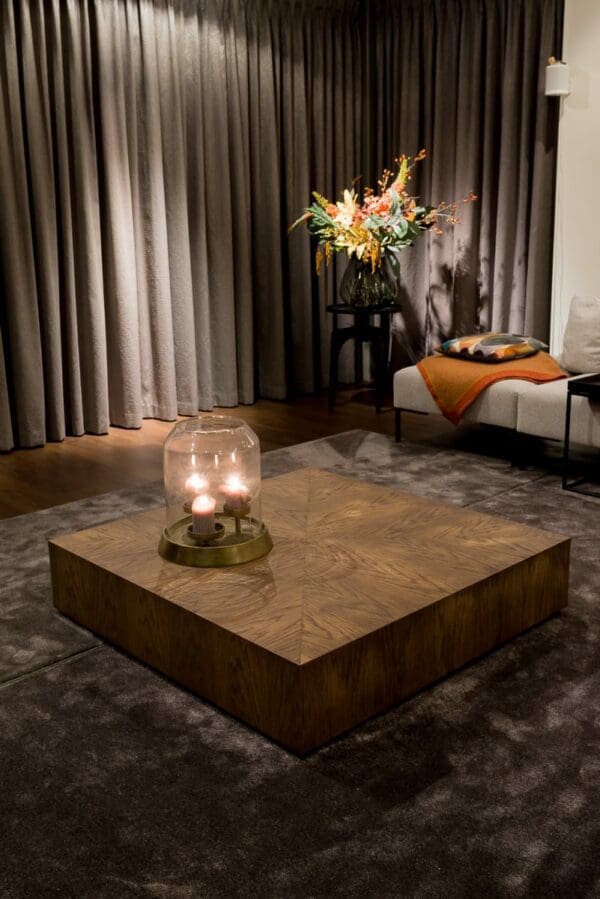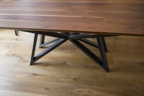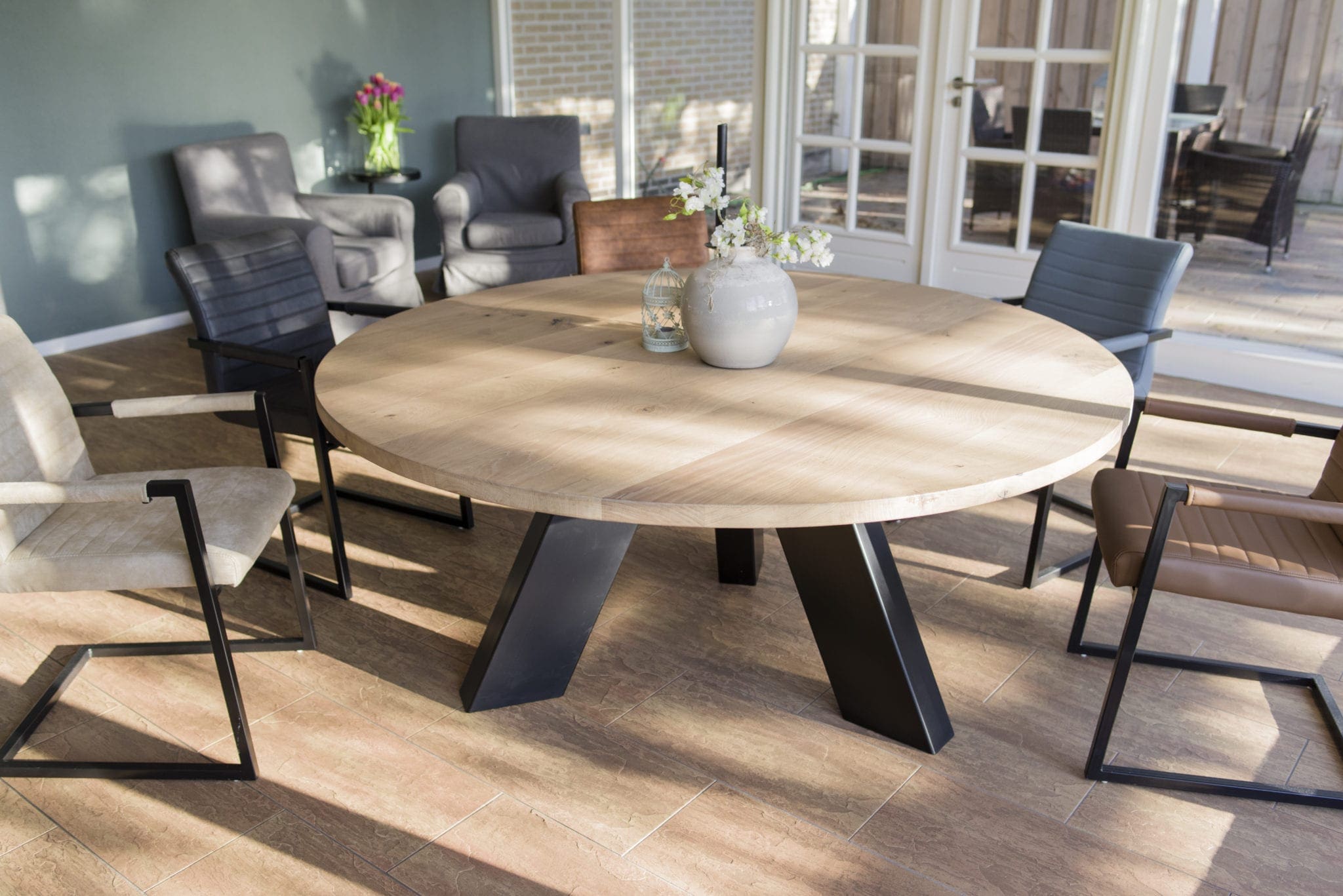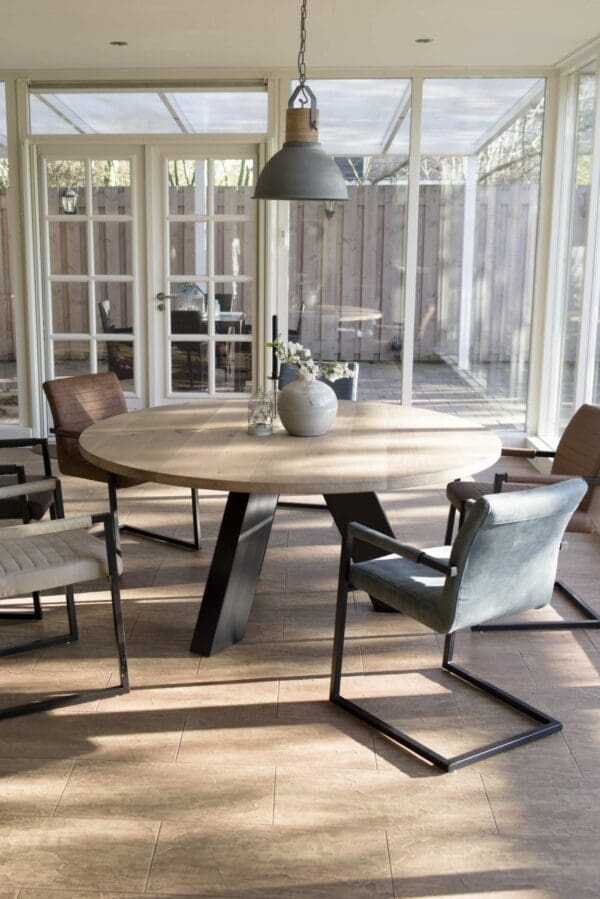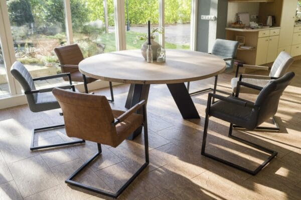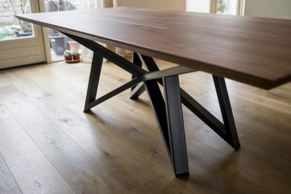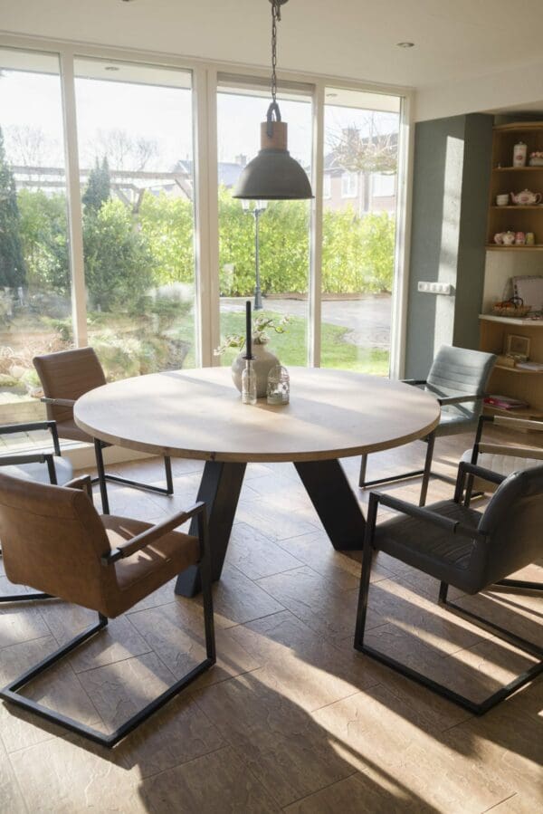 Het blad is gemaakt uit rustiek eiken, dus met meer noesten, van 4 cm dik massief Europees eiken. De rand is zwart gemaakt en ook afgerond op de hoekpunten. De behandeling is in 2 systemen – olie +lak – en kan in meerdere kleuren worden afgewerkt. Naast een mooie uitstraling, zorgt deze behandeling ervoor dat je tafel optimaal is beschermd tegen kringen en vlekken.