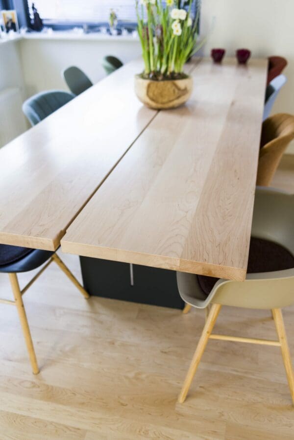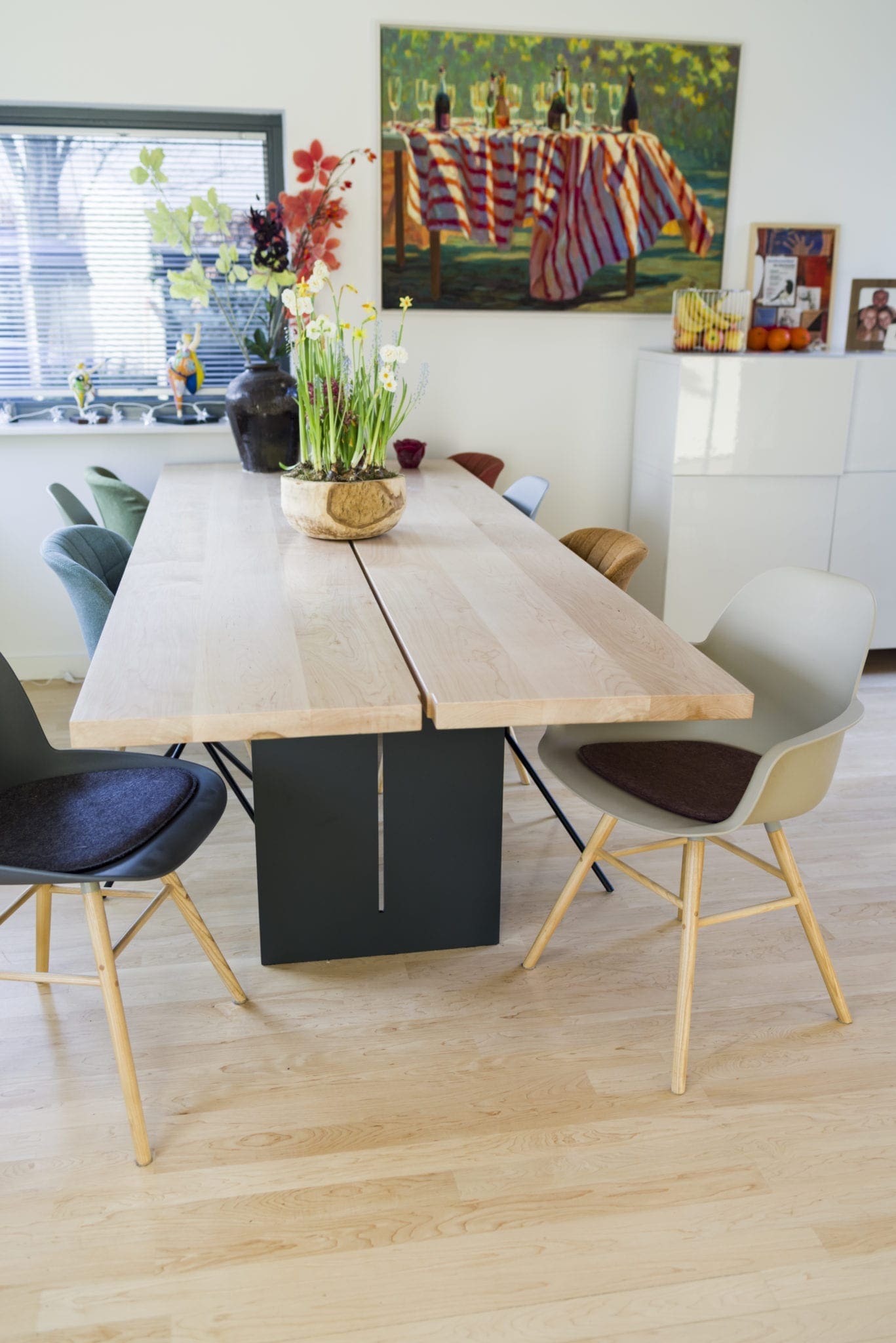 Dit hangt van verschillende factoren af, zoals de inrichtingsstijl, smaak, kwaliteit en prijs. De meest voorkomende materialen zijn hout, metaal en glas óf een combinatie hiervan. Massieve platen zijn zeer populair als tafelblad, mede dankzij de duurzame eigenschappen en het fraaie, natuurlijke uiterlijk. Ook multiplex, medium-density fibreboard (MDF) en betontriplex zijn geschikt als tafelblad. Deze houtsoorten zijn opgebouwd uit meerdere dunne lagen en hebben een milde reactie op verschillen in luchtvochtigheid. Goed om te weten dat wij multiplex en MDF met een speciale coating in effen kleuren (mat, zijdeglas en hoogglans) kunnen spuiten, waardoor de tafel meer belasting aan kan.
