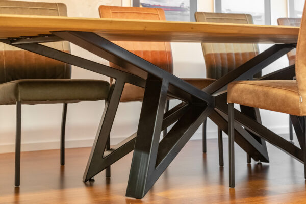 Het blad is gemaakt uit rustiek eiken, dus met meer noesten, van 4 cm dik massief Europees eiken. De rand is zwart gemaakt en ook afgerond op de hoekpunten. De behandeling is in 2 systemen – olie +lak – en kan in meerdere kleuren worden afgewerkt. Naast een mooie uitstraling, zorgt deze behandeling ervoor dat je tafel optimaal is beschermd tegen kringen en vlekken.