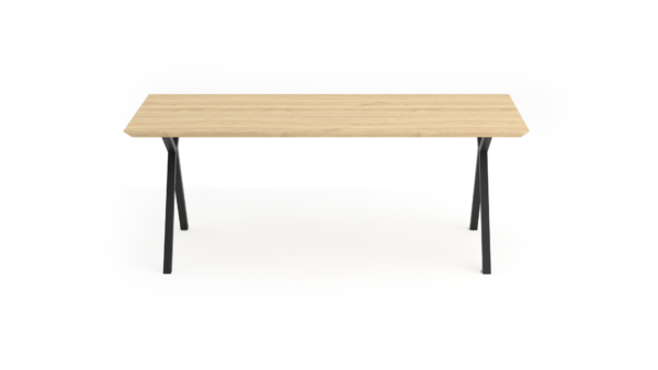 Het blad is gemaakt uit rustiek eiken, dus met meer noesten, van 4 cm dik massief Europees eiken. De rand is zwart gemaakt en ook afgerond op de hoekpunten. De behandeling is in 2 systemen – olie +lak – en kan in meerdere kleuren worden afgewerkt. Naast een mooie uitstraling, zorgt deze behandeling ervoor dat je tafel optimaal is beschermd tegen kringen en vlekken.