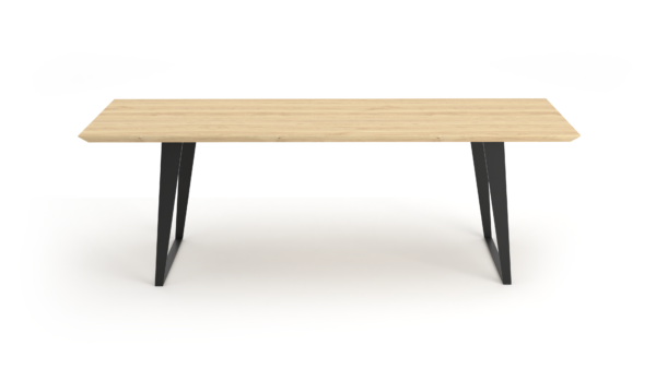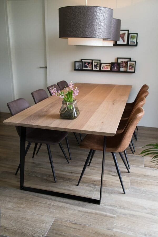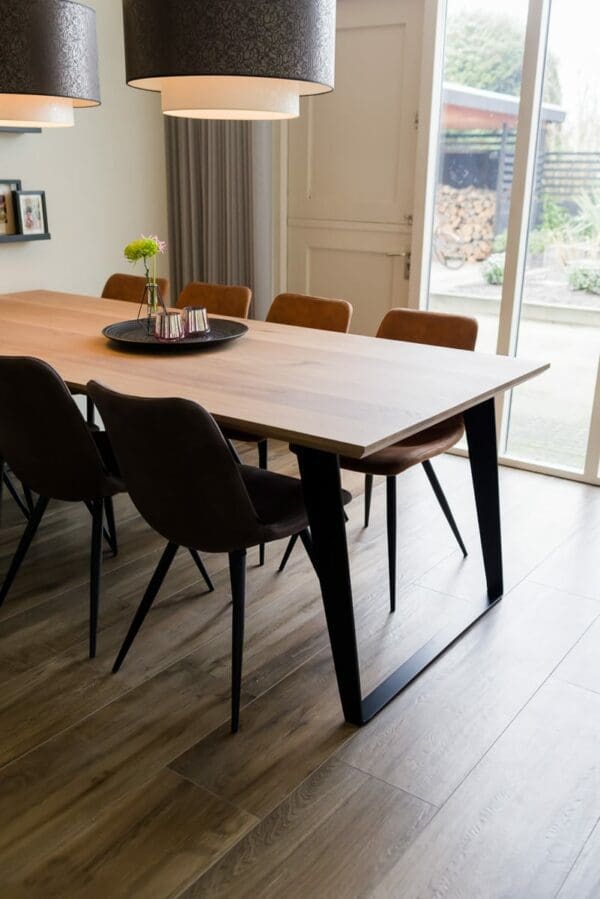 Het blad is gemaakt uit rustiek eiken, dus met meer noesten, van 4 cm dik massief Europees eiken. De rand is zwart gemaakt en ook afgerond op de hoekpunten. De behandeling is in 2 systemen – olie +lak – en kan in meerdere kleuren worden afgewerkt. Naast een mooie uitstraling, zorgt deze behandeling ervoor dat je tafel optimaal is beschermd tegen kringen en vlekken.