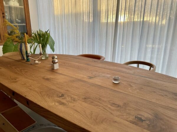 - Voor de met 3-componenten geoliede én 2-componentne gelakte tafelbladen is in het dagelijkse onderhoud afnemen met een droge doek voldoende. Om vlekken/kringen te verwijderen is een vochtige lauwe doek voldoende. Zie de pagina onderhoud voor meer informatie.