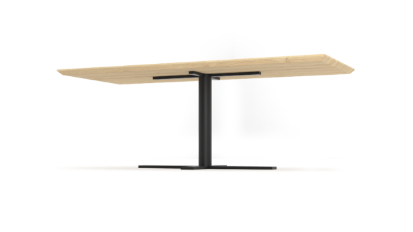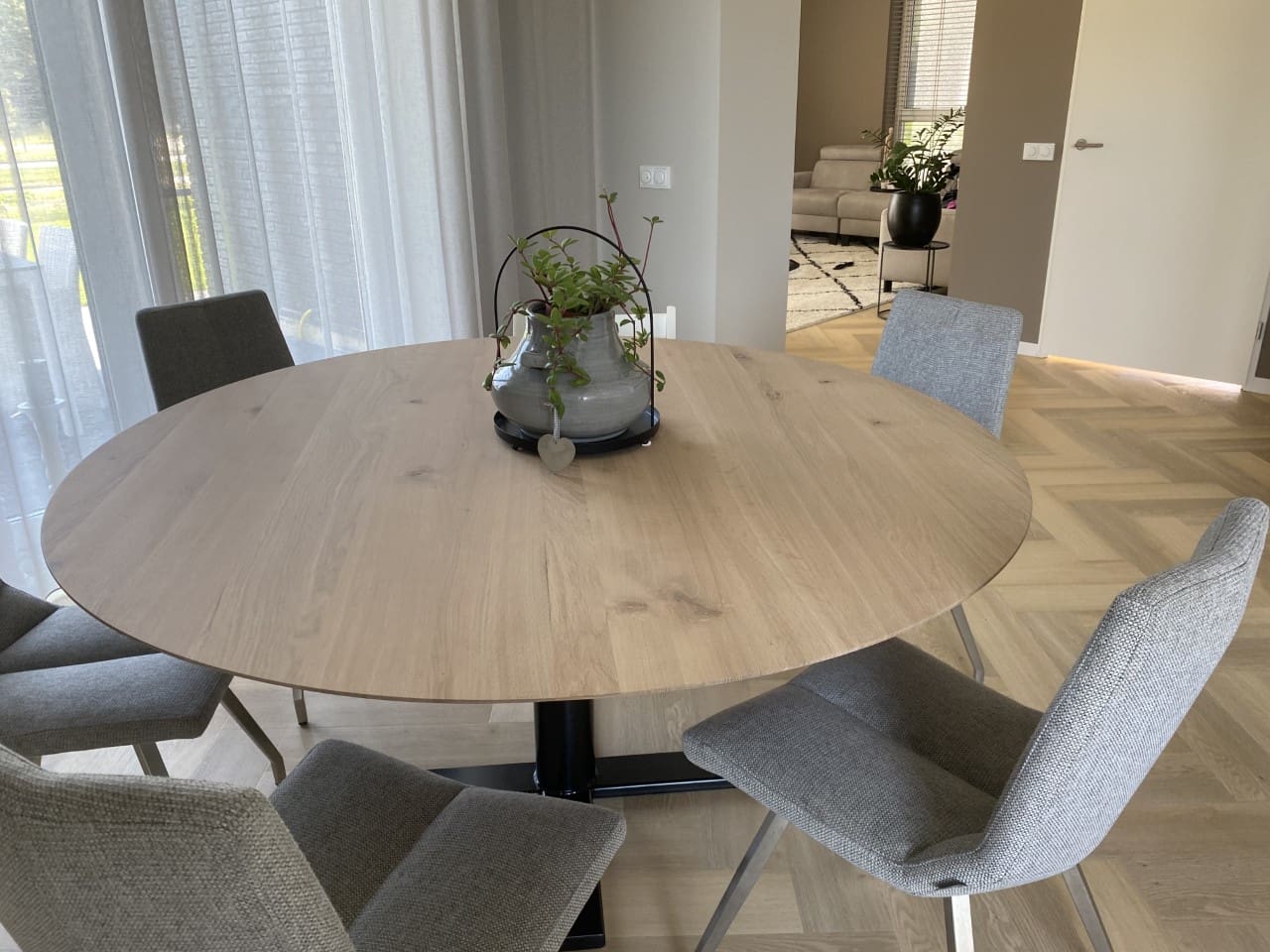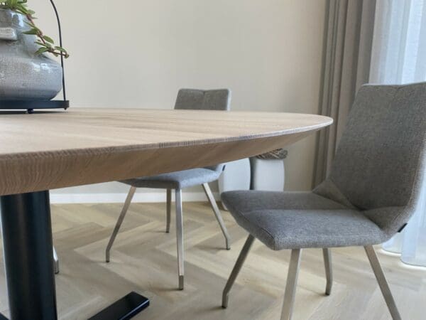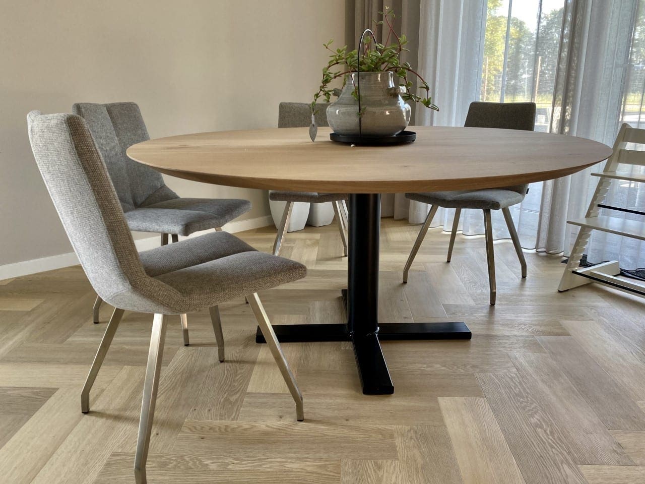 Het gepluste onderstel van eettafel Positivo staat fantastisch onder een rond blad, maar kan ook goed onder een rechthoekig of vierkant tafelblad. Het voordeel van dit onderstel is dat het niet ten koste gaat van beenruimte, waardoor u gezellig met veel mensen om uw nieuwe tafel kunt zitten. Op het voorbeeld ziet u een verjongd tafelblad, maar dit kan uiteraard ook met een recht blad. Net als al onze andere eettafels is ook eettafel Positivo naar uw specifieke wensen aan te passen.