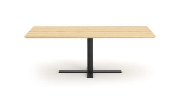 Het blad is gemaakt uit rustiek eiken, dus met meer noesten, van 4 cm dik massief Europees eiken. De rand is zwart gemaakt en ook afgerond op de hoekpunten. De behandeling is in 2 systemen – olie +lak – en kan in meerdere kleuren worden afgewerkt. Naast een mooie uitstraling, zorgt deze behandeling ervoor dat je tafel optimaal is beschermd tegen kringen en vlekken.