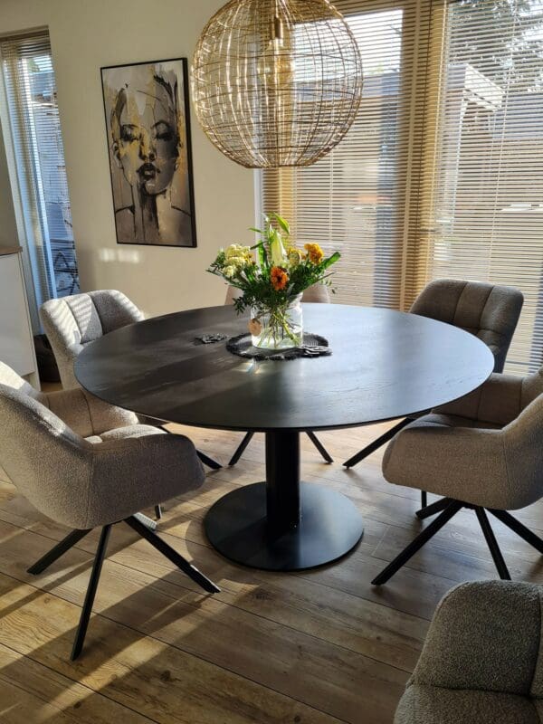 Het blad is gemaakt uit rustiek eiken, dus met meer noesten, van 4 cm dik massief Europees eiken. De rand is zwart gemaakt en ook afgerond op de hoekpunten. De behandeling is in 2 systemen – olie +lak – en kan in meerdere kleuren worden afgewerkt. Naast een mooie uitstraling, zorgt deze behandeling ervoor dat je tafel optimaal is beschermd tegen kringen en vlekken.