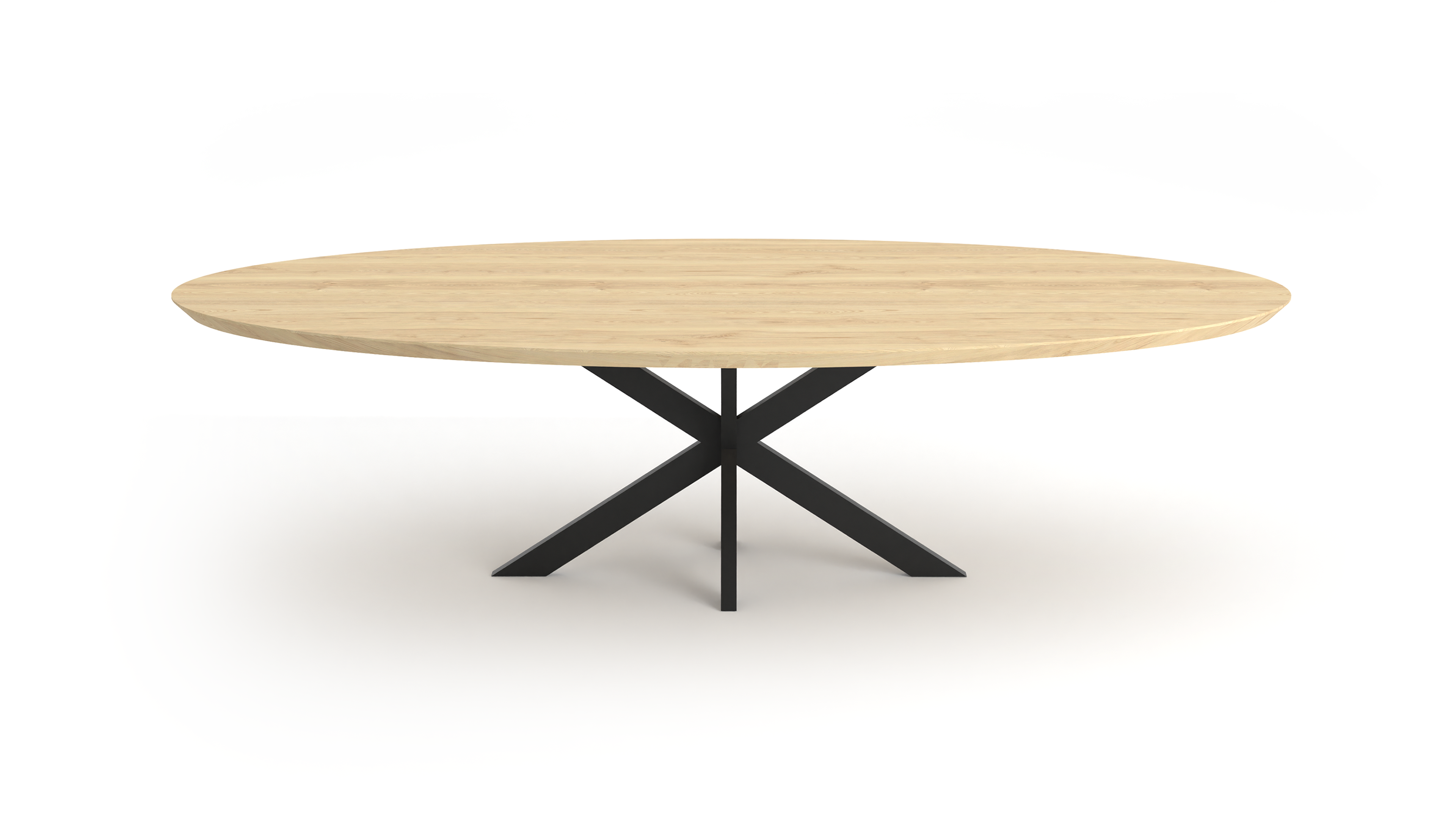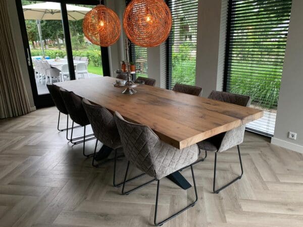 Het blad is gemaakt uit rustiek eiken, dus met meer noesten, van 4 cm dik massief Europees eiken. De rand is zwart gemaakt en ook afgerond op de hoekpunten. De behandeling is in 2 systemen – olie +lak – en kan in meerdere kleuren worden afgewerkt. Naast een mooie uitstraling, zorgt deze behandeling ervoor dat je tafel optimaal is beschermd tegen kringen en vlekken.
