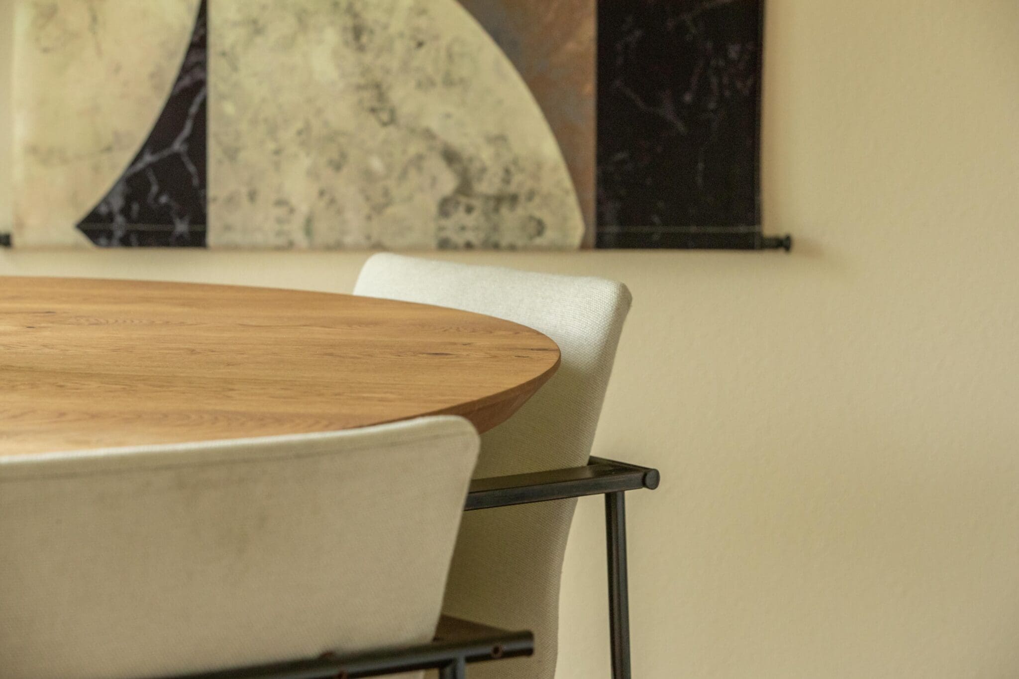 Eettafel Sottile combineert elegantie met een uniek design. Het slanke onderstel met twee benen creëert een speels effect onder de tafel, terwijl de symmetrie voor een rustige en harmonieuze uitstraling zorgt.