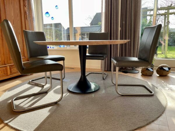 Het blad is gemaakt uit rustiek eiken, dus met meer noesten, van 4 cm dik massief Europees eiken. De rand is zwart gemaakt en ook afgerond op de hoekpunten. De behandeling is in 2 systemen – olie +lak – en kan in meerdere kleuren worden afgewerkt. Naast een mooie uitstraling, zorgt deze behandeling ervoor dat je tafel optimaal is beschermd tegen kringen en vlekken.