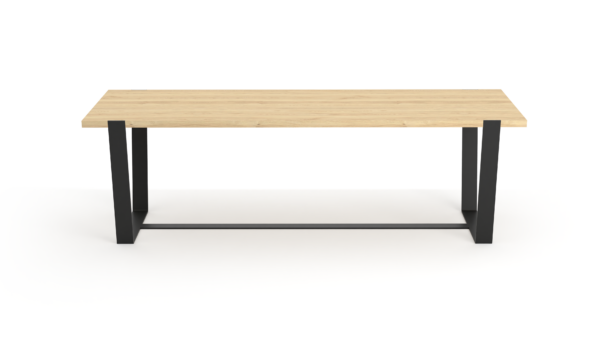 Het blad is gemaakt uit rustiek eiken, dus met meer noesten, van 4 cm dik massief Europees eiken. De rand is zwart gemaakt en ook afgerond op de hoekpunten. De behandeling is in 2 systemen – olie +lak – en kan in meerdere kleuren worden afgewerkt. Naast een mooie uitstraling, zorgt deze behandeling ervoor dat je tafel optimaal is beschermd tegen kringen en vlekken.