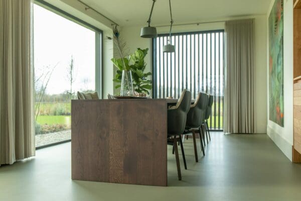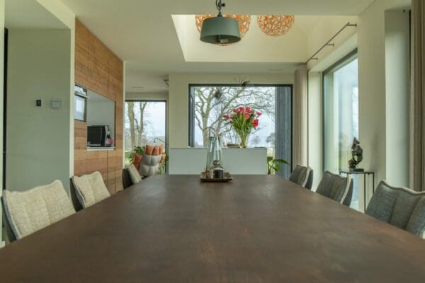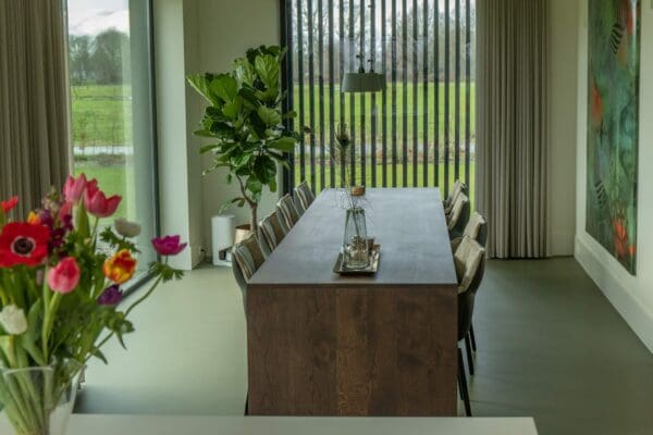 Je hebt waarschijnlijk al een beeld over waar de tafel moet komen te staan. Mocht je daarover twijfelen, laat je dan informeren of adviseren door ons. Onze handige 2D- en 3D-visualisaties vergemakkelijken dit proces, omdat je uitstekend kunt inschatten of de positie, plek en met name de grootte goed is. Wat de positie en ruimte van de tafel betreft is het prettig om ongeveer een meter ruimte te hebben om de tafel heen. Houd hiermee rekening met voldoende doorloopruimte en stoelen die makkelijk en ver genoeg naar achteren geschoven kunnen worden. Twijfel je over de grootte? Dan is een uitschuifbare tafel of het plaatsen van een bankje in plaats van stoelen een optie.