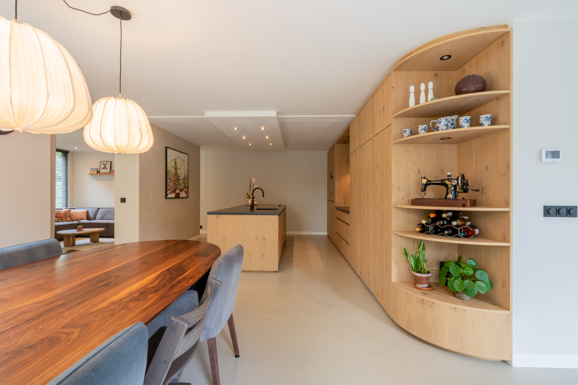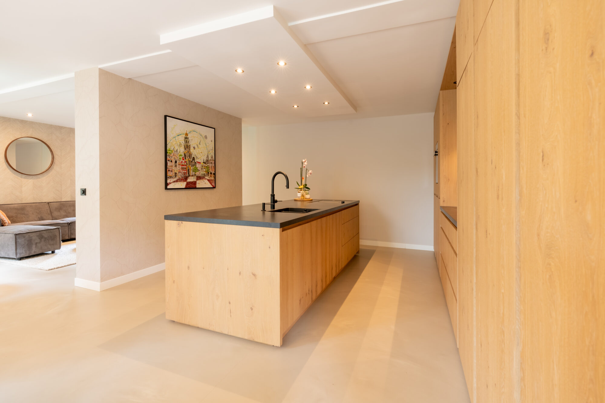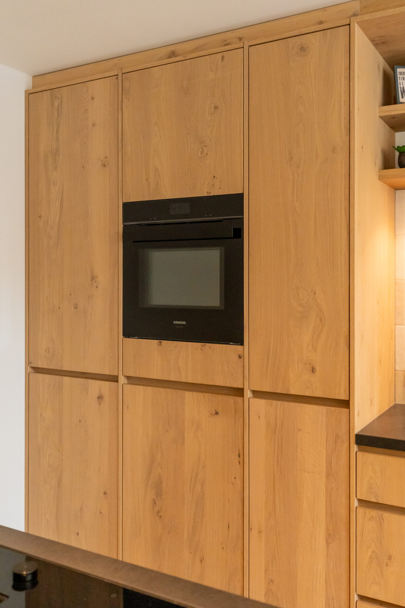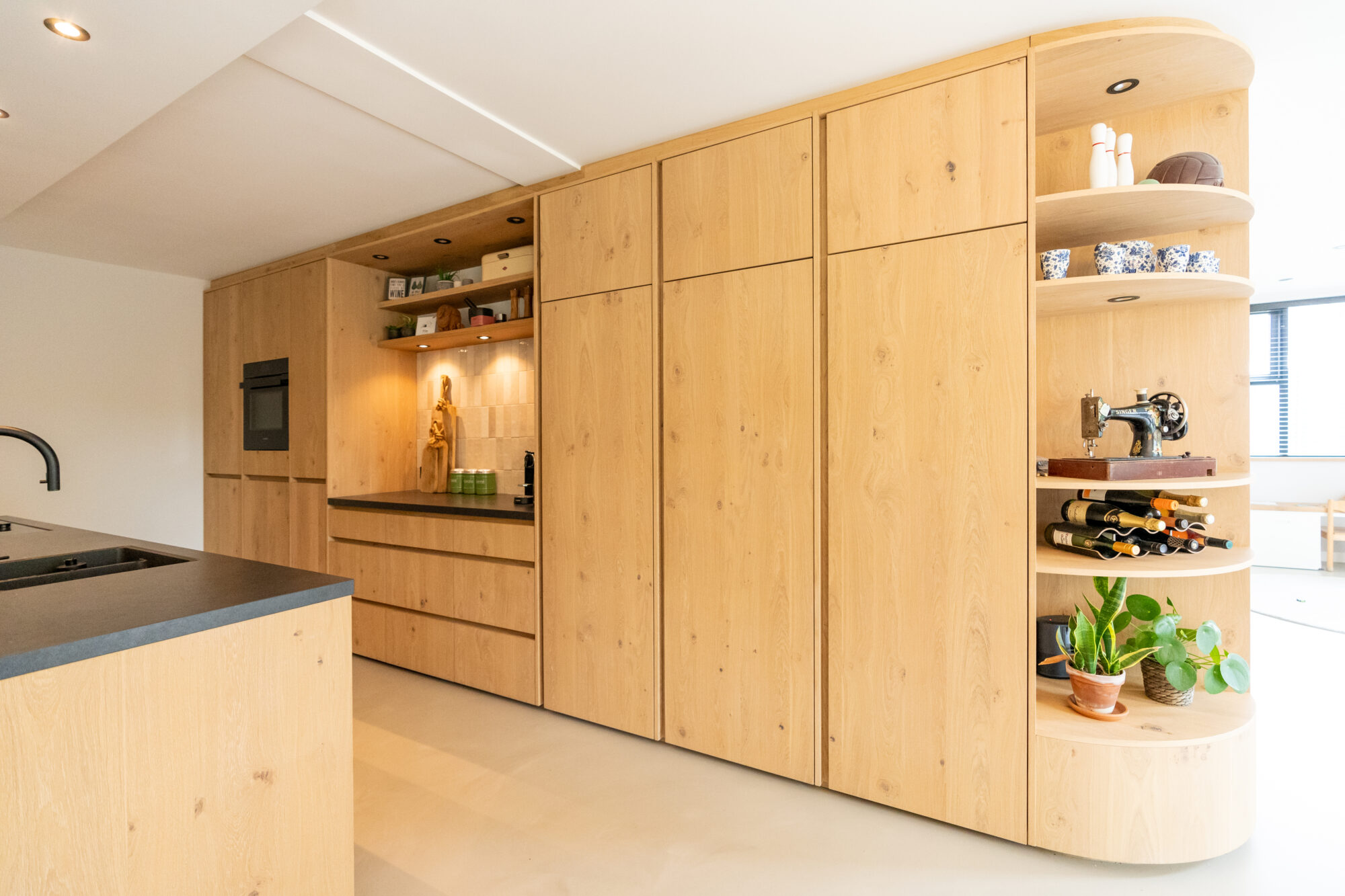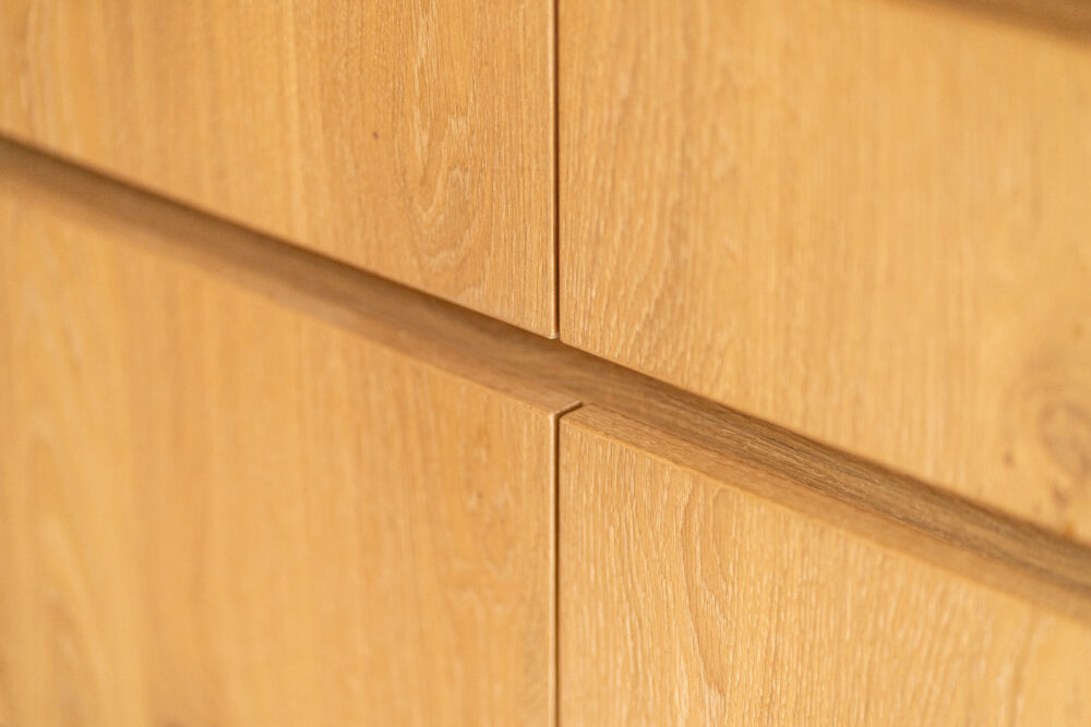 De fronten zijn uitgevoerd in eikenfineer met een greeplijst van massief eiken, in dezelfde nerfrichting en kleur. In combinatie met een PU-gietvloer geeft dit een rustige, warme basis die goed past in een modern interieur. Het fineer is behandeld met een drie-componenten olie in de gewenste kleur, gevolgd door drie ultramatte laklagen voor bescherming en een rustige uitstraling.