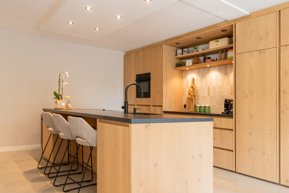 Voor een klant die een rustige en natuurlijke uitstraling zocht, hebben we een maatwerk keuken ontwikkeld in eikenfineer. De volledige wand is 549 cm breed. Dat is precies het voordeel van een maatwerk keuken: wij werken niet met vaste blokmaten van 60 of 30 cm, maar delen de keuken exact in zoals de ruimte het vraagt. Hierdoor lopen alle lijnen strak door en ontstaat één geheel.